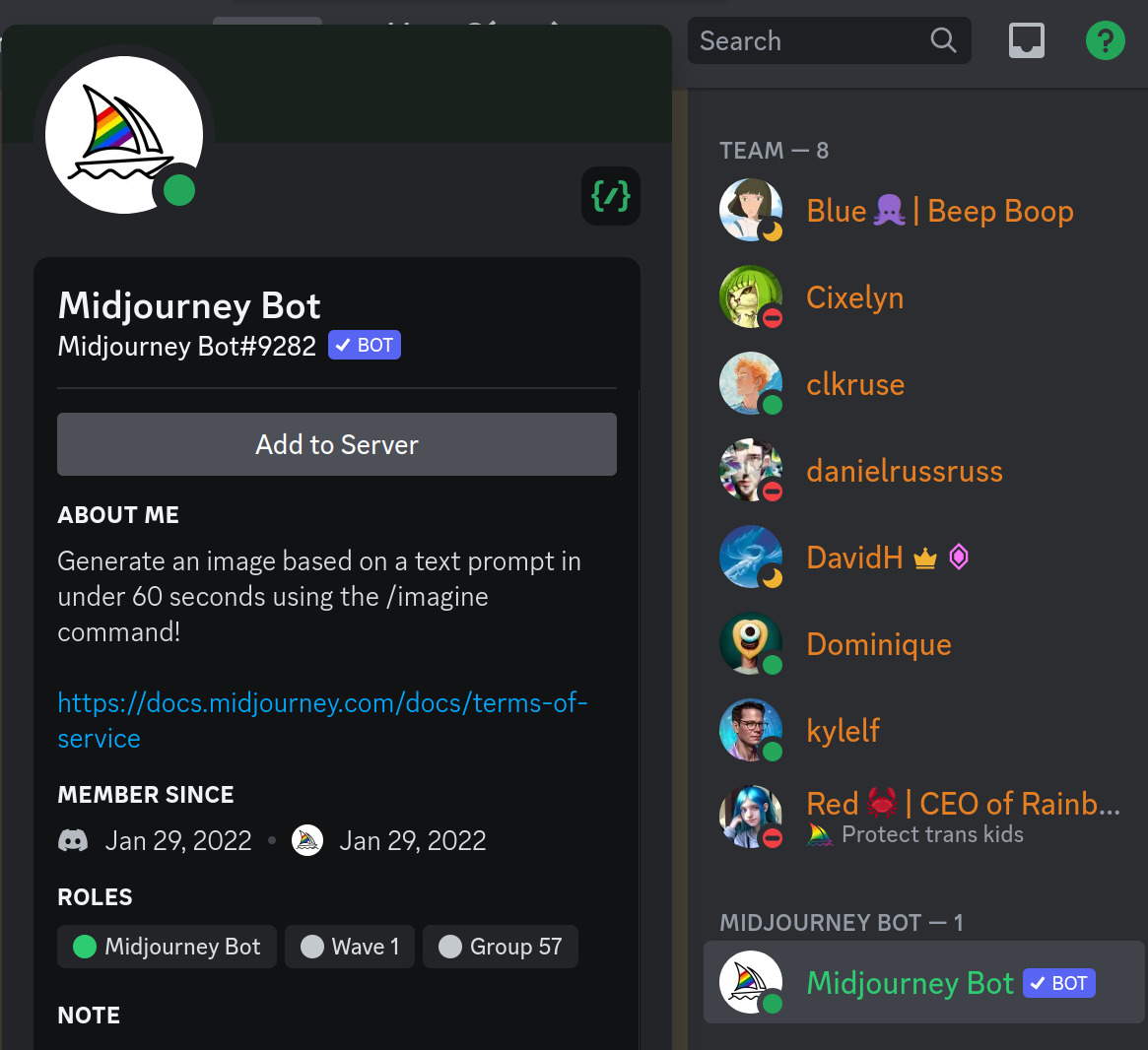 Go ahead and pull up your Discord account, click on your server in the left hand menu, and make sure you followed the steps above to invite the Midjourney Bot to your Discord server.